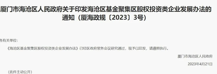 2023年9月4日,海沧湾基金聚集区获厦门市地方金融监督管理局批复。基金聚集区以发展股权投资基金为主,同时引入金融、法律、担保、咨询等中介机构入驻,2023年12月5日海沧区修订发布了《海沧区基金聚集区股权投资类企业发展办法》,为基金聚集区的发展提供了政策支持。