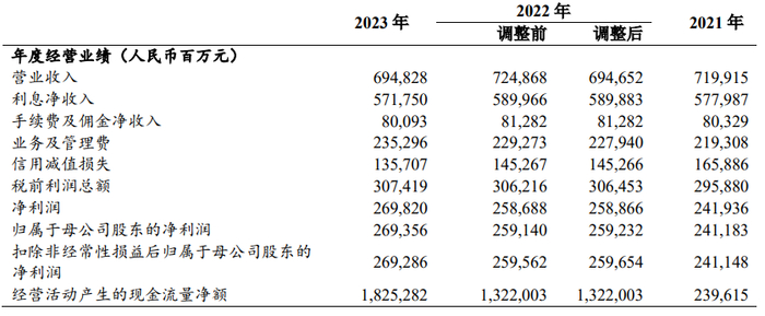 中证智能财讯 农业银行(601288)3月29日披露2023年年报。2023年,公司实现营业总收入6948.28亿元,同比增长0.03%;归母净利润2693.56亿元,同比增长3.91%;扣非净利润2692.86亿元,同比增长3.71%;经营活动产生的现金流量净额为18252.82亿元,同比增长38.07%;报告期内,农业银行基本每股收益为0.72元,加权平均净资产收益率为10.91%。公司2023年年度利润分配预案为:拟向全体股东每10股派2.309元(含税)。