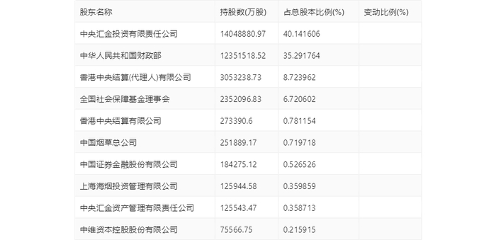 年报显示,2023年年末公司十大流通股东中,持股最多的为中央汇金投资有限责任公司,占比40.14%。十大流通股东名单相比2023年三季报维持不变。在具体持股比例上,中央汇金投资有限责任公司、香港中央结算(代理人)有限公司、香港中央结算有限公司持股有所上升。