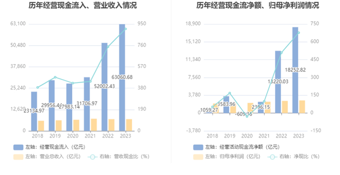 2023年,公司经营活动现金流净额为1.83万亿元,同比增长38.07%;筹资活动现金流净额3074.40亿元,同比增加92.23亿元;投资活动现金流净额-1.33万亿元,上年同期为-1.05万亿元。