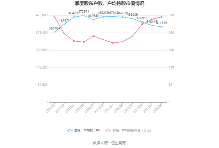 筹码集中度方面,截至2023年年末,公司A股股东总户数为41.15万户,较三季度末下降了6916户,降幅1.65%;户均持股市值由三季度末的286.94万元上升至294.85万元,增幅为2.76%。