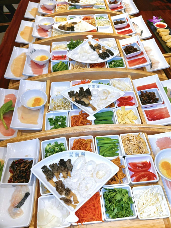 芸南道过桥米线鲜汤的制作除了延续传统做法,使用土鸡、老鸭和猪骨慢慢炖煮,还独具匠心地加入了云南特有的野生菌类,如鸡枞菌、竹荪、松茸、羊肚菌、松露等,配料足足有18种,荤素搭配,色味俱全。野生菌的融入,为原本鲜美的汤汁增添了更加丰富的特色菌香。