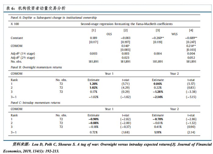 4.机构投资者和个人投资者之间的差异以及价格动量策略的隔夜/日内回报模式。发现机构投资者整体上倾向于在日内反对动量,这种趋势随时间和股票变化而异,产生了从日内到隔夜的拉锯战,影响动量策略的回报。