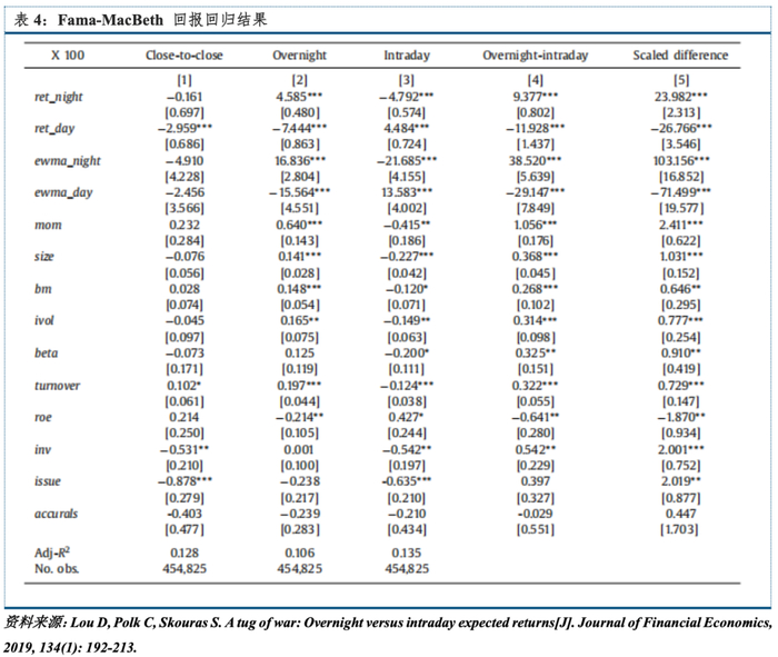 接着,文章将这种新的市场思维方式运用到数据中,首次研究了这些基本收益组成部分的持续性和逆转模式。作者发现,在过去一个月中隔夜回报相对较高的股票,其隔夜回报在未来一个月中仍然相对较高,与此同时日间回报相对较低,这样的发现在经济和统计上都具有显著意义。这种拉锯战可以通过收益的任一组成部分进行识别。相对具有较高日内回报的股票,在随后的一个月内,其日内回报仍然相对较高,而隔夜回报相对较低。