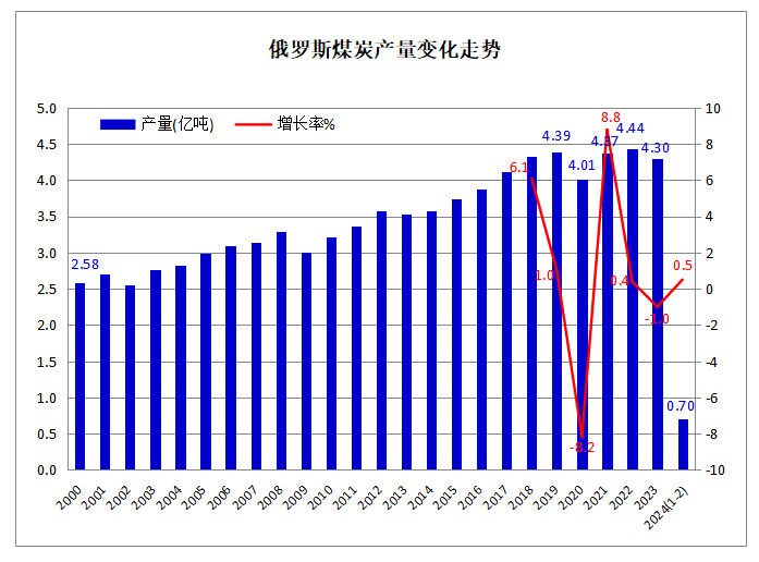 2024年1-2月俄罗斯煤炭产量同比增长0.5%,海运煤炭出口同比下降15.6%