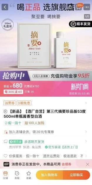 金沙酒业的大单品为摘要(珍品版),在天猫摘要酒类旗舰店里,第三代摘要珍品版53度500ml单瓶价格为折后680元。