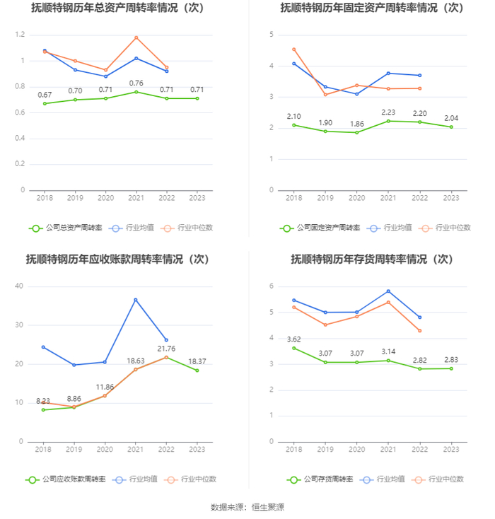 营运能力方面,2023年,公司公司总资产周转率为0.71次,上年同期为0.71次(2022年行业平均值为0.92次,公司位居同行业11/13);固定资产周转率为2.04次,上年同期为2.20次(2022年行业平均值为3.70次,公司位居同行业11/13);公司应收账款周转率、存货周转率分别为18.37次、2.83次。