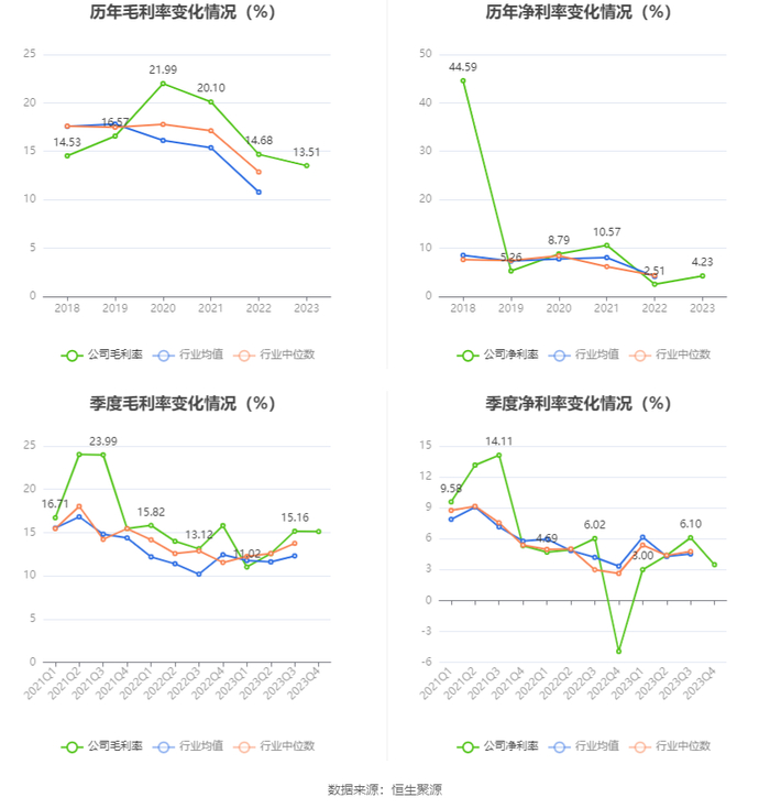 2023年,公司毛利率为13.51%,同比下降1.17个百分点;净利率为4.23%,较上年同期上升1.72个百分点。从单季度指标来看,2023年第四季度公司毛利率为15.11%,同比下降0.70个百分点,环比下降0.05个百分点;净利率为3.48%,较上年同期上升8.42个百分点,较上一季度下降2.62个百分点。