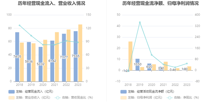 2023年,公司经营活动现金流净额为1.80亿元,同比增长308.75%;筹资活动现金流净额9069.65万元,同比增加3736.98万元;投资活动现金流净额-7.36亿元,上年同期为6860.28万元。