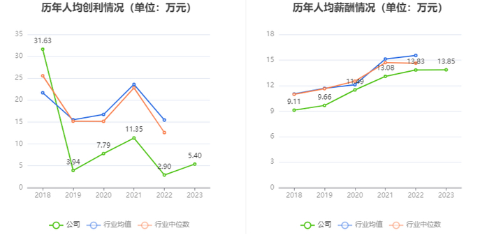 截至2023年末,公司员工总数为6715人,人均创收127.69万元,人均创利5.40万元,人均薪酬13.85万元,较上年同期分别增长10.87%、86.35%、0.11%。