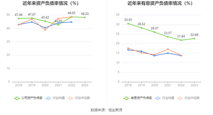 在偿债能力方面,公司2023年年末资产负债率为48.20%,相比上年末下降0.45个百分点;有息资产负债率为22.68%,相比上年末上升0.84个百分点。