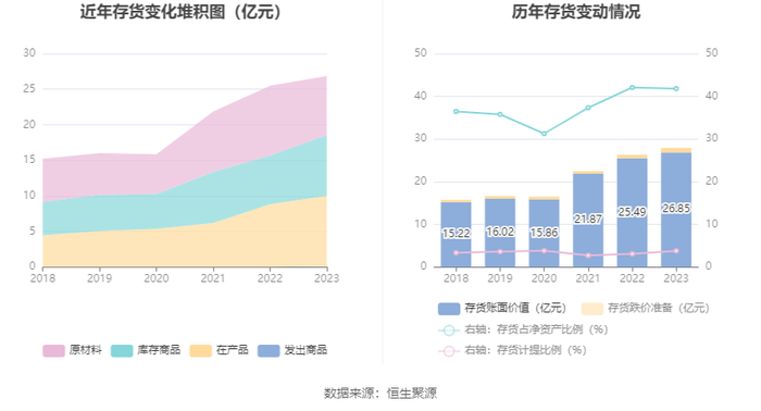 从存货变动来看,截至2023年末,公司存货账面价值为26.85亿元,占净资产的41.83%,较上年末增加1.36亿元。其中,存货跌价准备为1.06亿元,计提比例为3.8%。