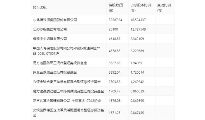 年报显示,2023年年末公司十大流通股东中,新进股东为江苏沙钢集团有限公司、兴证全球合衡三年持有期混合型证券投资基金、交银施罗德国企改革灵活配置混合型证券投资基金,取代了三季度末的太平人寿保险有限公司-传统-普通保险产品-022L-CT001沪、易方达新经济灵活配置混合型证券投资基金、基本养老保险基金一二零五组合。在具体持股比例上,香港中央结算有限公司、中国人寿保险股份有限公司-传统-普通保险产品-005L-CT001沪、兴全合泰混合型证券投资基金持股有所上升,东北特殊钢集团股份有限公司、易方达国防军工混合型证券投资基金、易方达品质动能三年持有期混合型证券投资基金、易方达基金管理有限公司-社保基金17042组合持股有所下降。