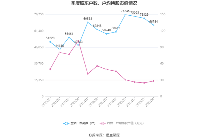 筹码集中度方面,截至2023年年末,公司股东总户数为6.68万户,较三季度末下降了6545户,降幅8.93%;户均持股市值由三季度末的25.20万元上升至28.70万元,增幅为13.89%。