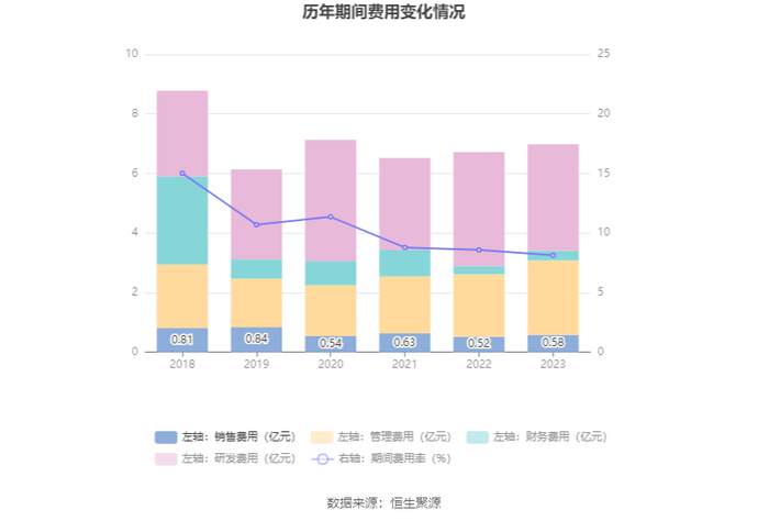 2023年,公司期间费用为6.98亿元,较上年同期增加2627.18万元;但期间费用率为8.14%,较上年同期下降0.45个百分点。其中,销售费用同比增长13.06%,管理费用同比增长19.2%,研发费用同比下降6.77%,财务费用同比增长18.78%。