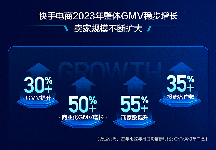 GMV持续增长背后,既是用户心智的逐步成熟,也是平台流量的高效利用。在2024年3月26日举办的快手磁力大会上,快手方面披露了一组电商经营维度的数据——2023年,快手电商GMV提升超过30%,商家数量提升超过55%,商业化GMV增长超过50%,投流客户数增长超过35%,电商商家智能投放产品全站推广客户渗透率达到20%。
