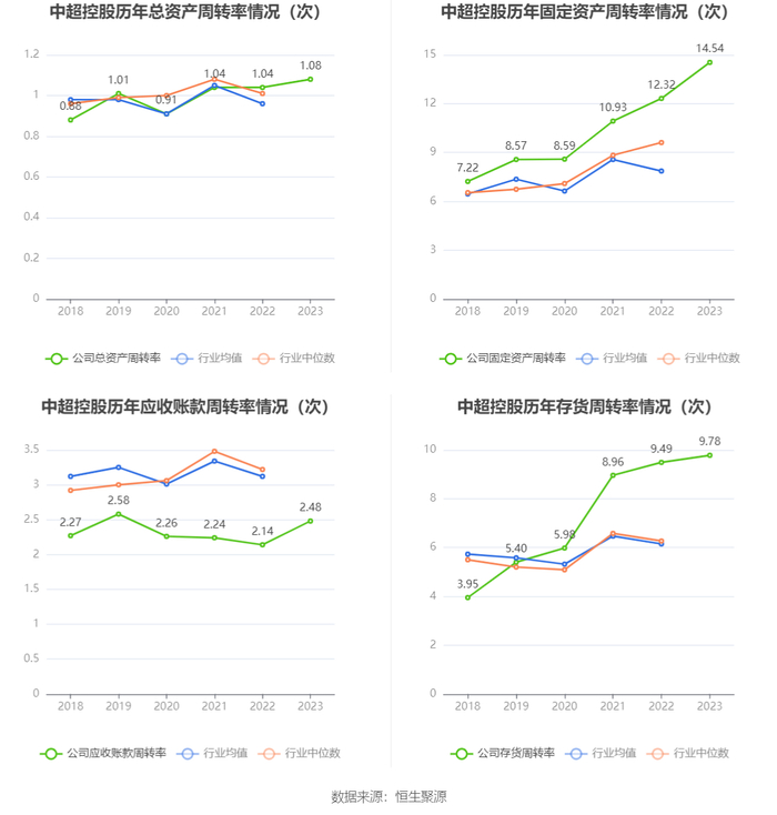 营运能力方面,2023年,公司公司总资产周转率为1.08次,上年同期为1.04次(2022年行业平均值为0.96次,公司位居同行业17/36);固定资产周转率为14.54次,上年同期为12.32次(2022年行业平均值为7.86次,公司位居同行业7/36);公司应收账款周转率、存货周转率分别为2.48次、9.78次。