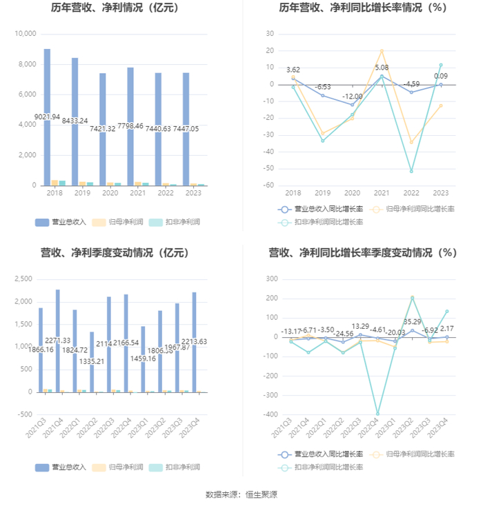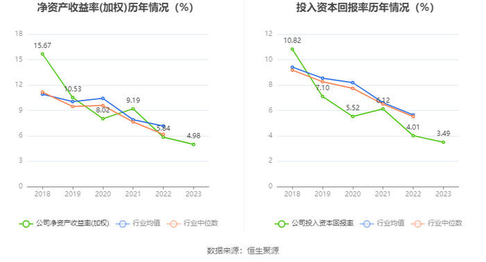 数据显示,2023年公司加权平均净资产收益率为4.98%,较上年同期下降0.86个百分点;公司2023年投入资本回报率为3.49%,较上年同期下降0.52个百分点。