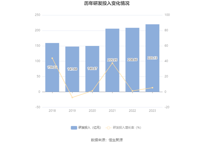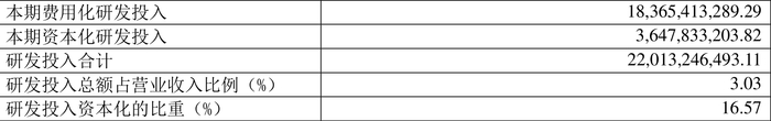 2023年全年,公司研发投入金额为220.13亿元,同比增长5.50%;研发投入占营业收入比例为3.03%,相比上年同期上升0.14个百分点。此外,公司全年研发投入资本化率为16.57%。