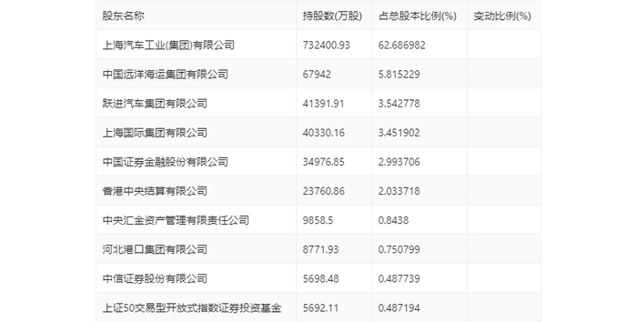 年报显示,2023年年末公司十大流通股东中,持股最多的为上海汽车工业(集团)有限公司,占比62.69%。十大流通股东名单相比2023年三季报维持不变。在具体持股比例上,中信证券股份有限公司、上证50交易型开放式指数证券投资基金持股有所上升,香港中央结算有限公司持股有所下降。
