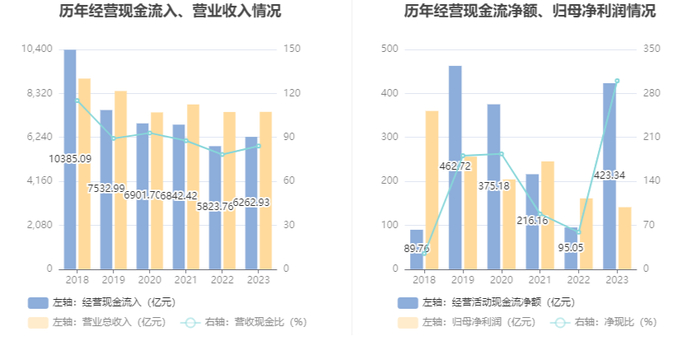 2023年,公司经营活动现金流净额为423.34亿元,同比增长345.41%;筹资活动现金流净额-100.58亿元,同比减少191.94亿元;投资活动现金流净额-422.34亿元,上年同期为-67.79亿元。