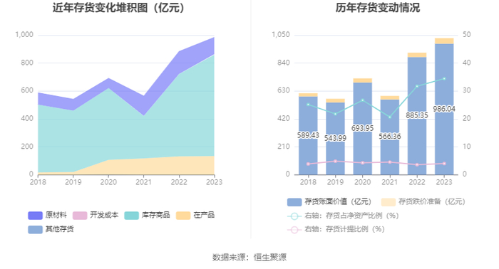 从存货变动来看,截至2023年年末,公司存货账面价值为986.04亿元,占净资产的34.44%,较上年末增加100.69亿元。其中,存货跌价准备为41.5亿元,计提比例为4.04%。