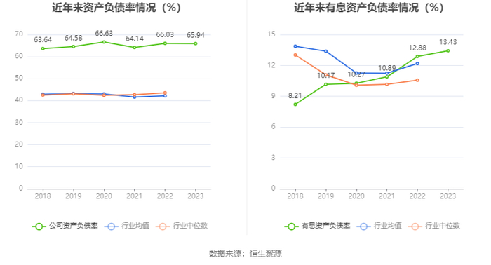 在偿债能力方面,公司2023年年末资产负债率为65.94%,相比上年末下降0.09个百分点;有息资产负债率为13.43%,相比上年末上升0.55个百分点。