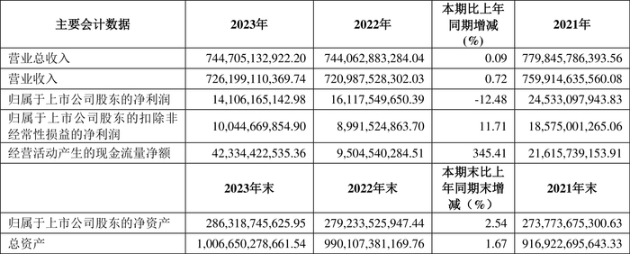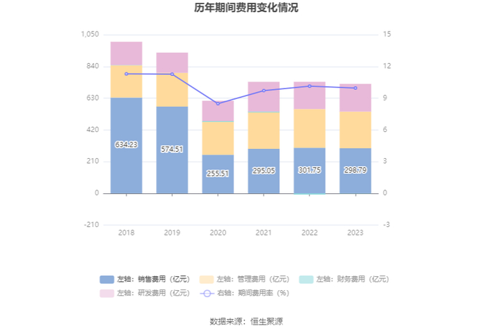 2023年,公司期间费用为723.28亿元,较上年同期减少7.55亿元;期间费用率为9.96%,较上年同期下降0.18个百分点。其中,销售费用同比下降0.98%,管理费用同比下降5.46%,研发费用同比增长1.86%,财务费用由去年同期的-7.64亿元变为-1.57亿元。