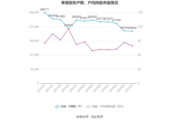 筹码集中度方面,截至2023年年末,公司股东总户数为19.81万户,较三季度末下降了1133户,降幅0.57%;户均持股市值由三季度末的86.81万元下降至79.81万元,降幅为8.06%。