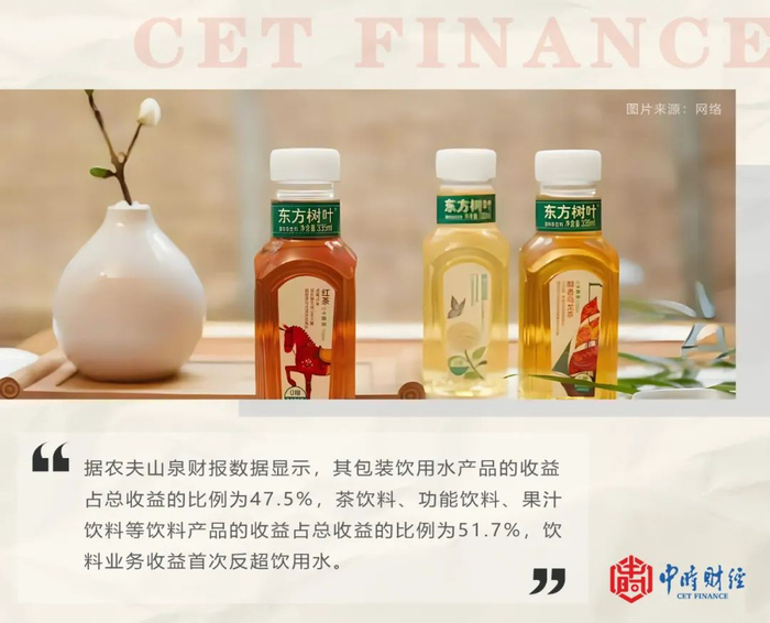 据农夫山泉财报数据显示,其包装饮用水产品的收益占总收益的比例为47.5%,茶饮料、功能饮料、果汁饮料等饮料产品的收益占总收益的比例为51.7%,饮料业务收益首次反超饮用水。