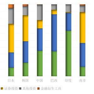 我国对外负债规模同步增长,结构分布更加多元化。2023年末,我国对外负债6.7万亿美元,较2004年末增长8.6倍,占全球对外负债总规模的比重在2.9%左右,较2004年末占比增加1.7个百分点。从结构看,发达国家开放的金融市场决定其证券投资负债占总负债的比例较高,如日本、美国、法国、英国等主要发达国家占比均超过50%。对于多数发展中国家,对外负债则以吸收直接投资为主,如2023年9月末,巴西和印度直接投资负债占比分别为61%和40%,证券投资占比普遍较低。近年来我国大力引进外资,同时有序开放国内资本市场,我国吸收外来投资结构更加多元。截至2023年末,我国吸收境外直接投资、证券投资和以存贷款、贸易信贷为主的其他投资负债分别为3.6万亿美元、1.7万亿美元和1.4万亿美元,占我对外负债总规模的比重为53%、25%和21%,其中,证券投资负债占比较2004年末增加11个百分点。