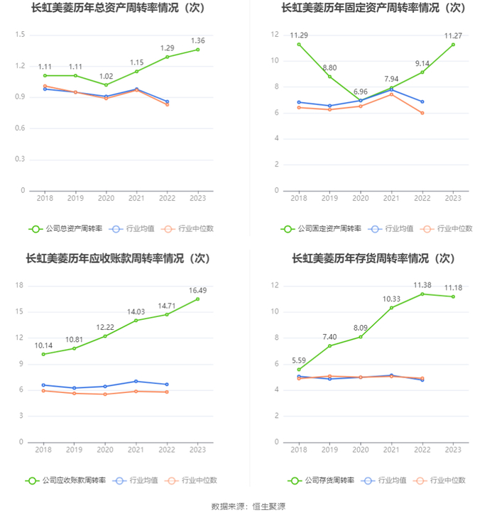 数据统计显示,长虹美菱近三年营业总收入复合增长率为16.37%,在家用电器行业已披露2023年数据的19家公司中排名第4。近三年净利润复合年增长率为120.09%,排名1/19。