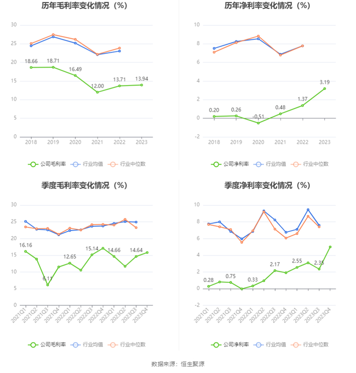 2023年,公司毛利率为13.94%,同比上升0.23个百分点;净利率为3.19%,较上年同期上升1.82个百分点。从单季度指标来看,2023年第四季度公司毛利率为15.82%,同比下降1.28个百分点,环比上升1.18个百分点;净利率为5.00%,较上年同期上升3.09个百分点,较上一季度上升2.65个百分点。