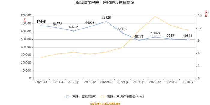 筹码集中度方面,截至2023年末,公司股东总户数为4.99万户,较三季度末下降了420户,降幅0.84%;户均持股市值由三季度末的12.62万元下降至11.63万元,降幅为7.83%。