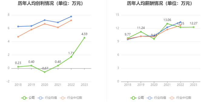 截至2023年末,公司员工总数为16149人,人均创收150.15万元,人均创利4.59万元,人均薪酬12.27万元,较上年同期分别增长6.38%、168.75%、0.17%。