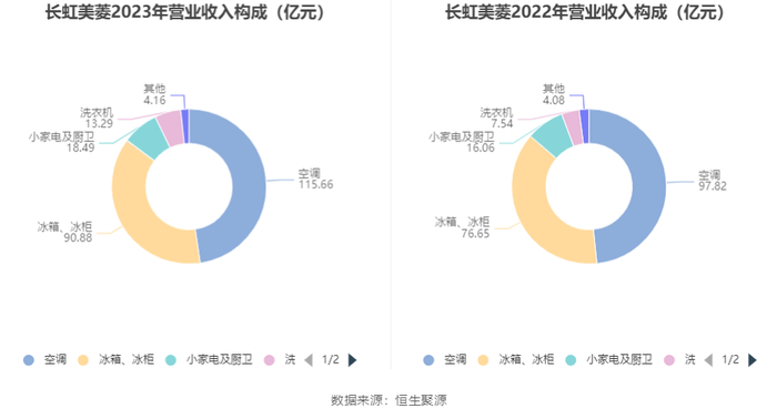 分产品来看,2023年公司主营业务中,空调收入115.66亿元,同比增长18.24%,占营业收入的47.70%;冰箱、冰柜收入90.88亿元,同比增长18.57%,占营业收入的37.48%;小家电及厨卫收入18.49亿元,同比增长15.16%,占营业收入的7.63%。