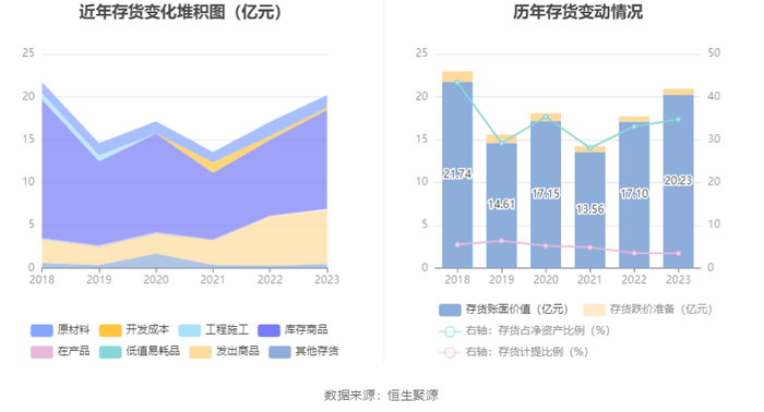 从存货变动来看,截至2023年年末,公司存货账面价值为20.23亿元,占净资产的34.73%,较上年末增加3.12亿元。其中,存货跌价准备为7216.64万元,计提比例为3.44%。