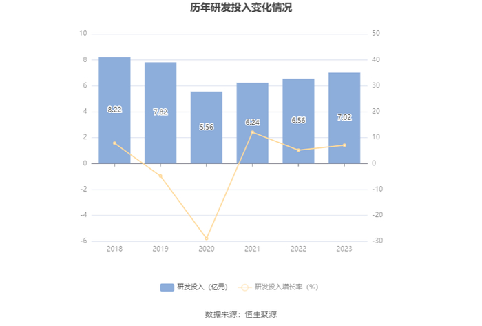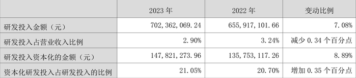 2023年全年,公司研发投入金额为7.02亿元,同比增长7.08%;研发投入占营业收入比例为2.90%,相比上年同期下降0.34个百分点。此外,公司全年研发投入资本化率为21.05%。