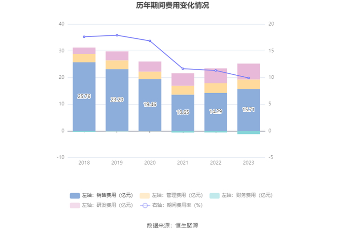 2023年,公司期间费用为24.11亿元,较上年同期增加1.18亿元;但期间费用率为9.94%,较上年同期下降1.40个百分点。其中,销售费用同比增长9.98%,管理费用同比增长0.71%,研发费用同比增长6.52%,财务费用由去年同期的-5521.47万元变为-1.19亿元。