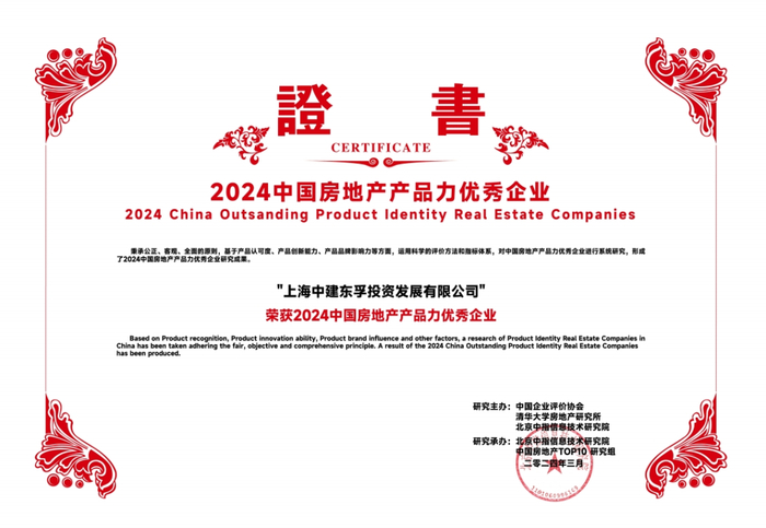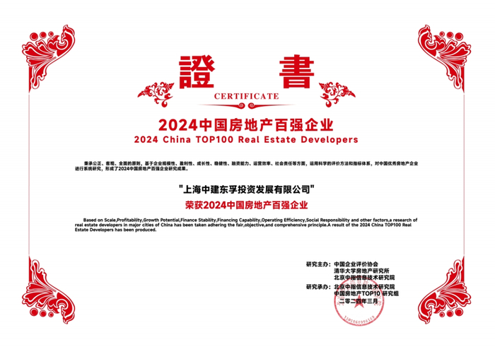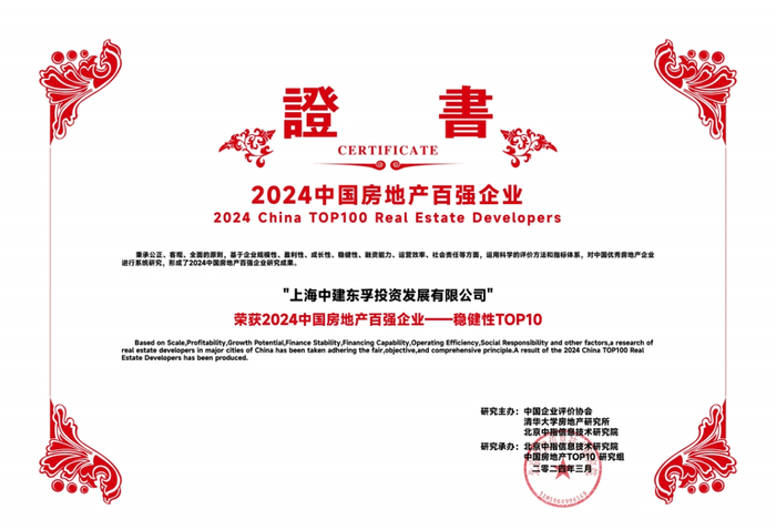 2024年3月21日,由中国企业评价协会、清华大学房地产研究所、北京中指信息技术研究院主办,北京中指信息技术研究院中国房地产TOP10研究组承办的“2024中国房地产百强企业研究成果发布会暨第二十一届中国房地产百强企业家论坛”在北京隆重召开。其中中建东孚荣获“2024中国房地产百强企业、2024中国房地产百强企业-稳健性TOP10、2024中国房地产百强企业-成长性TOP10、2024中国房地产产品力优秀企业、2024中国房地产交付力优秀企业、2024中国城市更新优秀企业、2024中国房地产经营安全性优秀企业”殊荣。