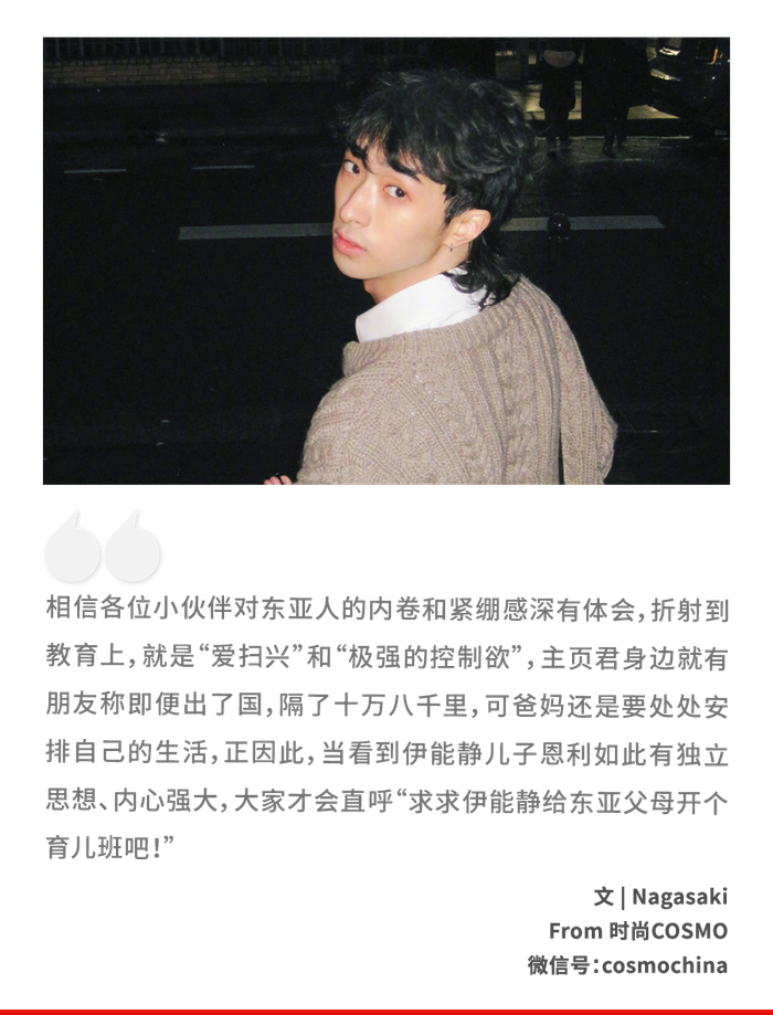 但伊能静却说:“性别是固定的,服装是流动的,恩利是自由的。”面对舆论对恩利的指责、批评甚至是谩骂,伊能静选择了足够的尊重和包容:“我会给他所有的自由,他在我的世界里,他可以成为自己。”