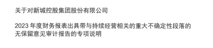 审计机构普华永道中天对新城控股2023年度财务报表出具了包含与持续经营相关的重大不确定性段落的无保留意见。
