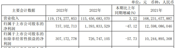 与收入形成对比的是,新城控股利润端承压。2023年,新城控股实现归母净利润7.37亿元,同比大降47.12%;同期扣非后净利润3.07亿元,降幅达57.73%。