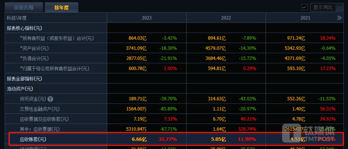 销售回款是房企补充资金的最重要来源,但大幅下滑的合同销售金额意味着新城控股的销售回款也同步减少。财务数据显示,2023年新城控股应收账款走上新高,达到6.66亿元,同比增长31.77%。