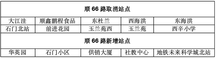 顺66路(望泉西里—春晖园)西延,接驳地铁17号线未来科学城北站,同时将地铁石门站至地铁南法信站路线调整为沿顺于路运行。
