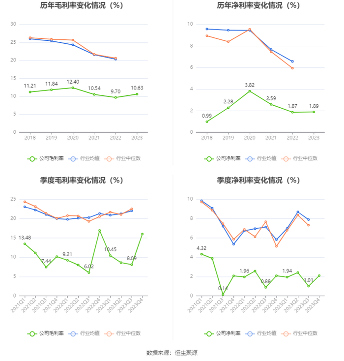 2023年,公司毛利率为10.63%,同比上升0.93个百分点;净利率为1.89%,较上年同期上升0.02个百分点。从单季度指标来看,2023年第四季度公司毛利率为16.02%,同比下降0.91个百分点,环比上升7.93个百分点;净利率为2.10%,较上年同期上升0.01个百分点,较上一季度上升1.09个百分点。