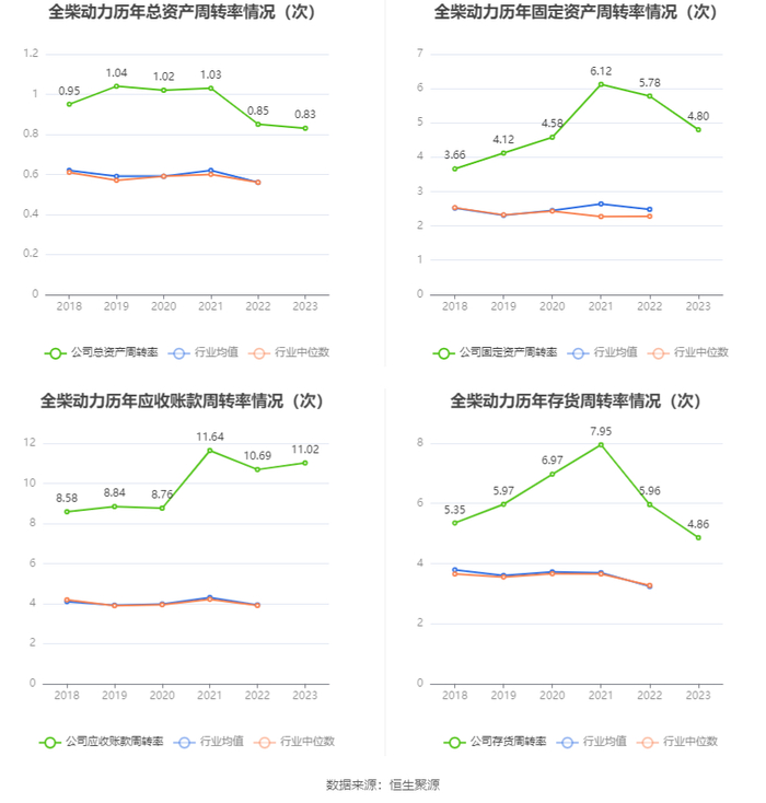 营运能力方面,2023年,公司公司总资产周转率为0.83次,上年同期为0.85次(2022年行业平均值为0.56次,公司位居同行业9/98);固定资产周转率为4.80次,上年同期为5.78次(2022年行业平均值为2.48次,公司位居同行业9/98);公司应收账款周转率、存货周转率分别为11.02次、4.86次。
