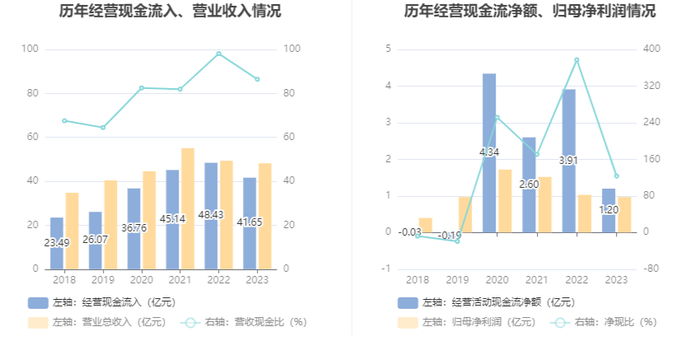 2023年,公司营业收入现金比为86.43%,净现比为123.52%。
