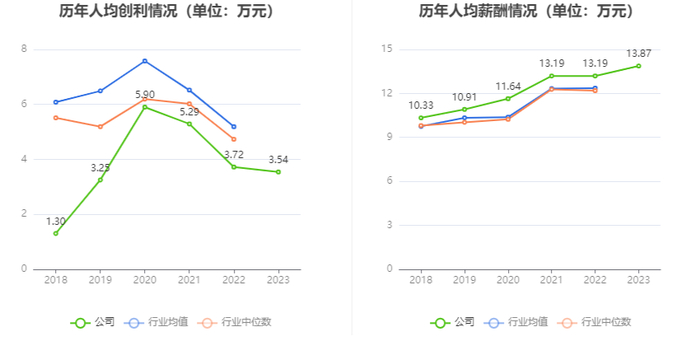 截至2023年末,公司员工总数为2748人,人均创收175.37万元,人均创利3.54万元,人均薪酬13.87万元,较上年同期分别变化-1.20%、-4.91%、5.19%。