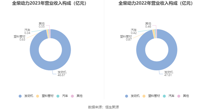 分产品来看,2023年公司主营业务中,发动机收入46.67亿元,同比下降1.97%,占营业收入的96.85%;塑料管材收入0.63亿元,同比下降27.36%,占营业收入的1.30%;汽车收入0.34亿元,同比下降18.96%,占营业收入的0.71%。